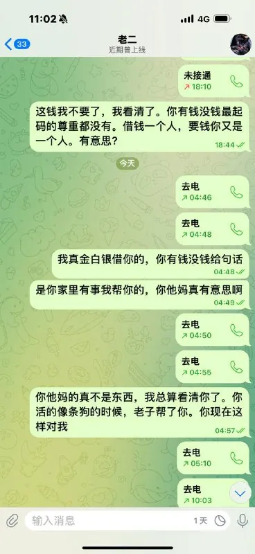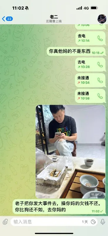 老二东北吉林人,老爱装逼没钱还装大款要泡二十岁小姑娘,借我钱去泡妞,说他家里孩子生病了,找我借了3500美金,现在飞机不回,电话不接。这些爸爸不要了。