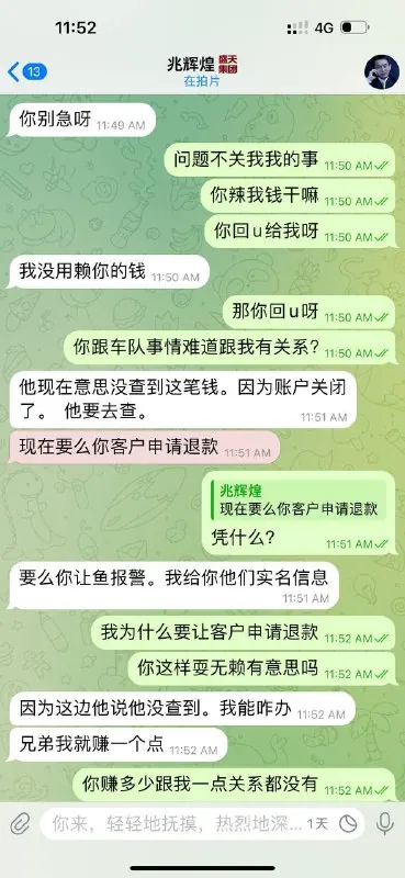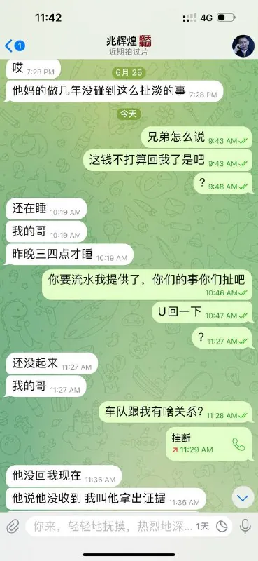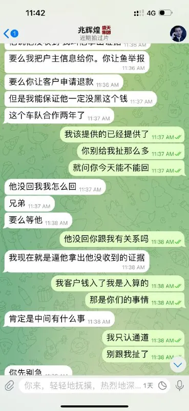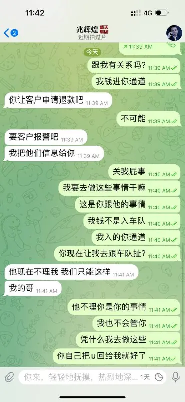 #网友爆料大家注意这个通道,小心避雷。之前在他通到进了一笔40万。他自己车队不负责。让我找车队,搞笑吧,我钱进你通道。我肯定找你呀,车队是你跟车队事情。后面说他没钱让我等他一段时间慢慢回钱给我现在已经4个月了,一分钱没回。信息不看电话不接。有跟他合作的自己注意点,能做这种事情的人有一次就会有第二次。希望大家别被坑了,通道多得事跟这种人合作哪天掉沟里都不知道。今天起祝你全家出门车撞死,生儿子夭折,老...