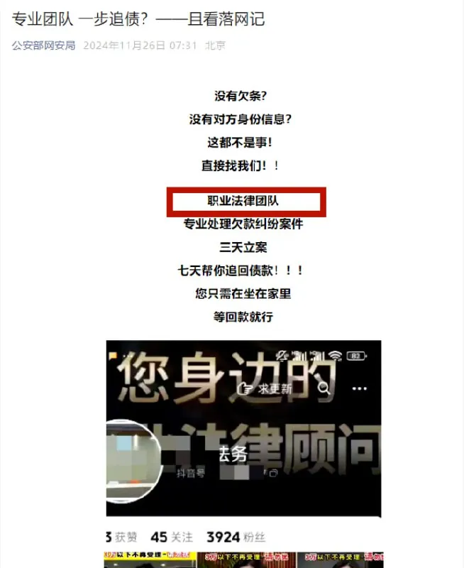 警方提醒:1. 在寻求法律服务和帮助时,一定要提高警惕,仔细甄别,切勿轻易相信仅通过网络聊天工具、电话等渠道进行沟通的“法务人员”,尽量选择与对方在其工作的律师事务所当面洽谈。2. 可以通过登录当地律师协会官网、相关政务服务网站等途径,查询核实律师的相关信息,也可向其所在的律师事务所进一步查证律师的姓名、从业信息及执业状况等。3. 正规的律师委托代理服务,双方需签订规范的委托代理合同或服务合同,合同中应明确约定服务费用的金额、收费标准以及支付方式等重要内容。对于那些以各种理由、名义提前索要钱财的情况,要保持高度警惕,以防遭遇诈骗。