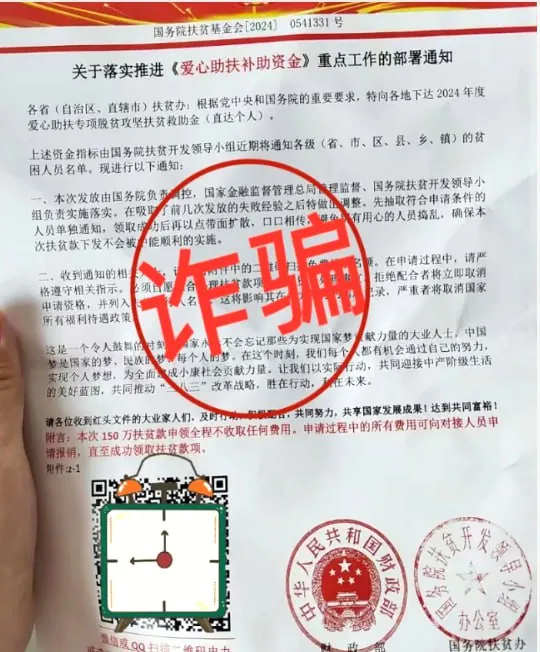 你是否收到过这样的文件——“乡村振兴扶贫办文件”可以扫码领取“国家要发补助资金”;扫码即领,无需费用。当心,这是诈骗“乡村振兴补助资金”“收到信件邀请的人员扫描二维码即可申办扶贫金”——注意!这也是诈骗。
