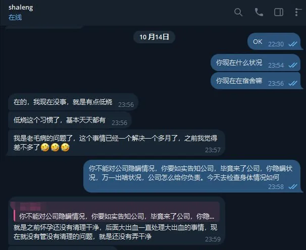 后经查证了解,该女子原在滂湛七号就职,是某精聊杀猪盘的代理,(前男友化名九林),吸毒成瘾,每天溜冰,溜冰时赌博搞了前男友几十万,因为溜冰怀孕肚子里小孩没有胎心,你真的是一点人性都没有,小孩这辈子投了你肚子里是倒八辈子大霉,现在该女子处于失联状态,不知死活。来公司希望各位同行见到该女子不要被表象迷惑,也奉劝该女子好自为之,你的护照已经发当地派出所,举报至国家反诈中心,当地实名举报三合一。