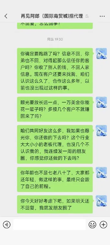 他是福建人,现在在老家开了一家度假村餐厅,可能生意不太好(以前听他说过)他是我合作多年的代理,因为他经常复制我的朋友圈广告,一度很多人认为我们是一家的。他人也不错,前几年合作的也挺顺利。客户也挺多,经常找我发货也赚了不少钱。我们也经常互相帮助。正常情况下我们会一直合作下去,客户也会越来越多。