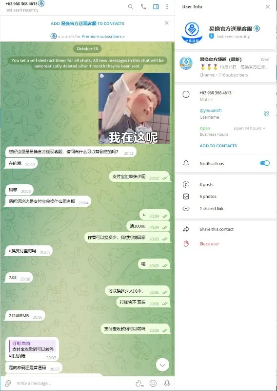 #网友爆料 #易换 #模仿号 #骗子哎,提起工资就糟心! 好不容易熬到月中发工资了,本来想着这几天汇率不错,去易换换换点支付宝,把月底的房贷还上,省点利息也好啊。结果呢,万万没想到! 我把钱转给易换换的客服后,他们迟迟没有给我转支付宝。 本来搜索飞机的时候,想着这个对应的有一个频道,就直接没有多想去联系换了,现在看起来,这个频道的飞机用户名里面加了链接,点那个都是跳转到一个飞机。虽然金额不算特别大,但也是我差不多一个月的工资啊! 现在客服也不回复了,一直说“马上,马上”,今天直接不搭理我了,哎,