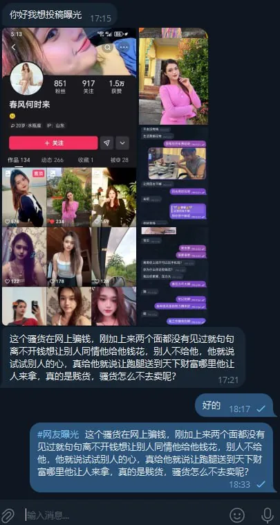 #网友爆料 这个骚货在网上骗钱。刚加上来,两个面都没有见过,就句句离不开钱,想让别人同情他给他钱花。