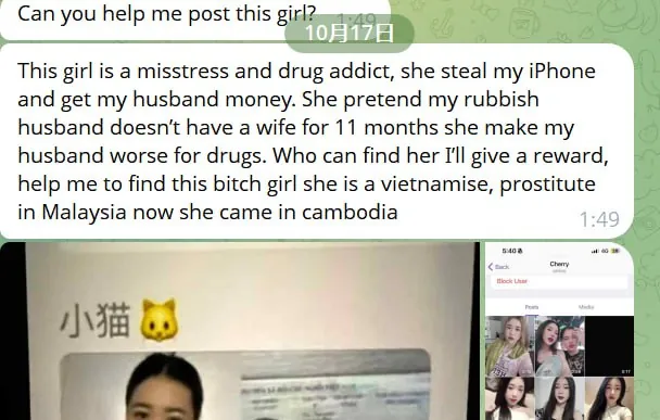 翻译:这个女孩是情妇和毒瘾者,她偷了我的iPhone,还拿了我丈夫的钱。她假装我那个没用的丈夫11个月没有妻子,她让我的丈夫因为毒品变得更糟。谁能找到她我会给赏金,帮我找到这个贱女孩,她是越南人,现在是马来西亚的妓女,现已来到柬埔寨。