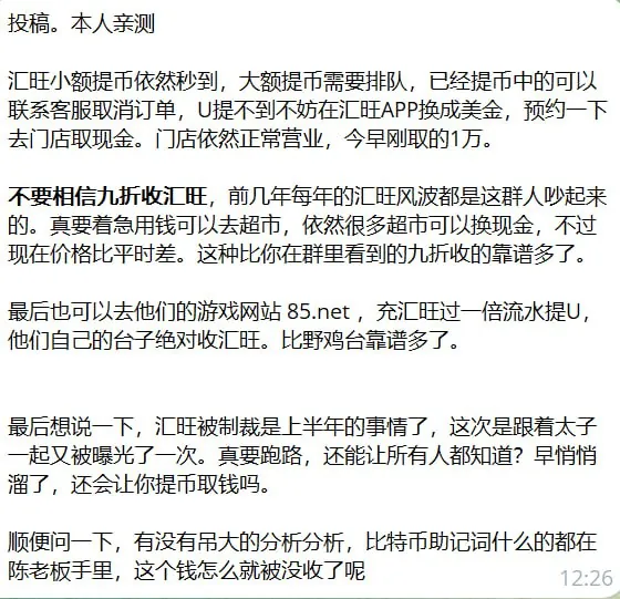 汇旺小额提币依然秒到,大额提币需要排队,已经提币中的可以联系客服取消订单,U提不到不妨在汇旺APP换成美金,预约一下去门店取现金。门店依然正常营业,今早刚取的1万。