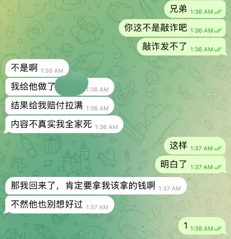 我的要求也简单,我也不敲诈你,吃我们兄弟的钱,吐出来,我只拿我该拿的钱,给你赚了多少钱你自己心里有数,最后你给我赔付拉满,请问你是人吗?记住我在中国不在妙瓦底,目前公安也在调查我们,看看是我们这些小虾米重要还是你这个老板重要