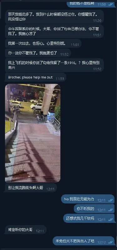 此人曾是我手下的代付人员,因国内无法继续发展,天天求着、哭着要来投奔我。看他可怜,我答应了帮忙,安排了机票和一条龙服务。然而,事实证明,他不过是个骗子,满嘴可怜的话,目的只是想让我给他打钱。