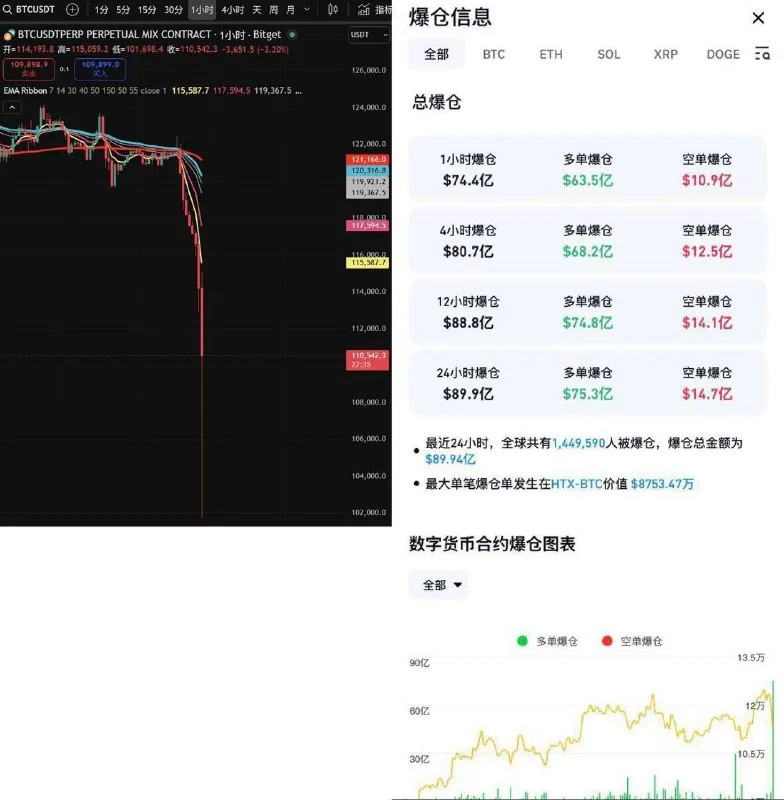 加密货币市场也跟着暴跌 比特币一天之内暴跌两万 一小时爆仓七十多亿美元 黄金大涨在创新高