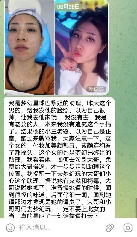 #网友爆料 :我是梦幻星球巴黎姐的助理,昨天这个男的给我发他的脸照,以为自己很帅,让我去他家玩 ,我没有去,我是有老公的人,本来我没有追究这个事情了。