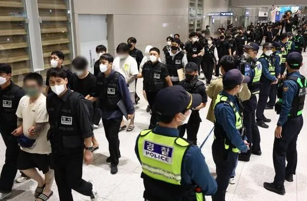 64名被遣返人员下飞机同时将立即以犯罪嫌疑人身份被押送至警方接受调查。这批人员涉嫌在柬埔寨犯罪园区参与电话诈骗等犯罪活动,其中59人在柬埔寨执法机构展开的打击电诈活动中被捕,另外5人为自行报警后从犯罪园区中获救。大多数人员为已在韩国被签发逮捕令的犯罪嫌疑人,包括被国际刑警组织列为红色通缉对象人员。