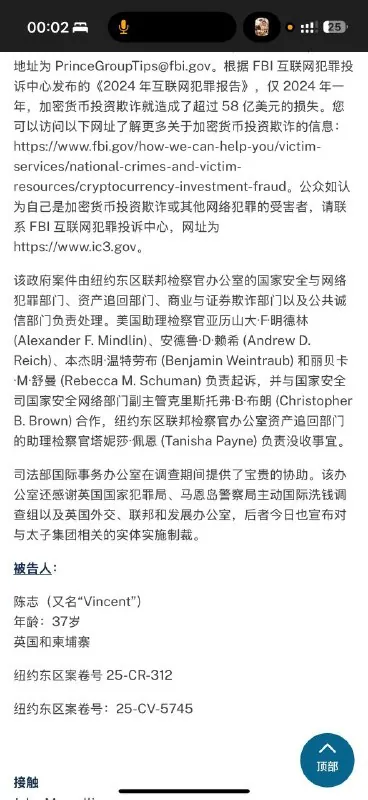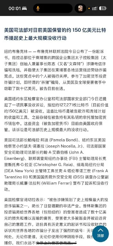 #产业新闻:太子集团董事长因经营柬埔寨强迫劳动诈骗团伙并参与加密货币诈骗计划而被起诉PS:没收150亿美元比特币