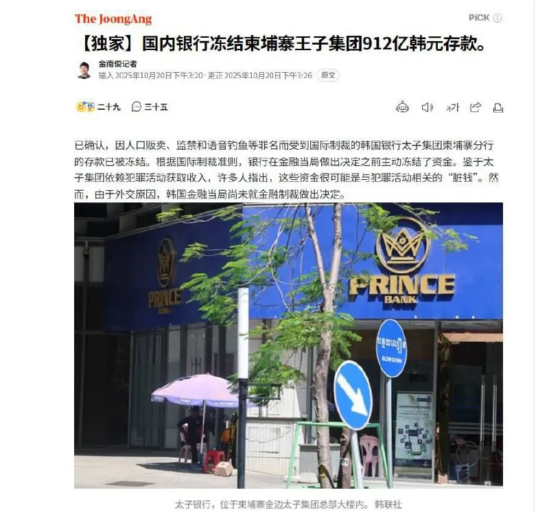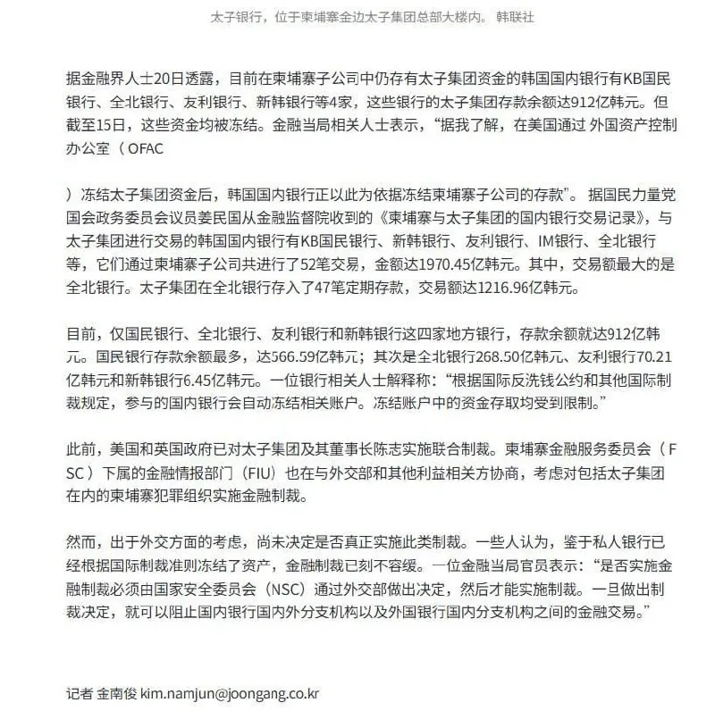 柬埔寨太子集团在韩国被冻结资金超过900亿韩元!包括投资。持有股份。开设的银行超过5家 等…