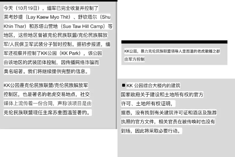 缅甸国家电视台(MRTV)今天报道称:缅甸军方突入并清剿了 坐落在Thaung Yin河畔、臭名昭著的 KK Park 园区!