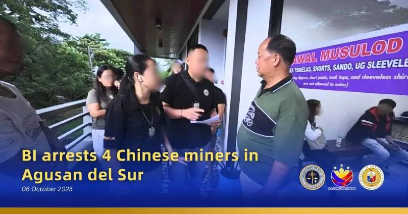 #菲律宾新闻 又有4名中国公民非法采矿被捕 移民局在阿古桑省逮捕4名涉非法采矿中国公民菲律宾移民局(BI)宣布,4名中国籍男子因涉嫌违反移民法并参与非法采矿活动,于10月1日在阿古桑德尔苏省圣弗朗西斯科镇被捕。此次行动是落实总统小马科斯关于打击环境破坏及外籍人士非法活动指令的一部分。据移民局情报处负责人介绍,本次行动由国家警察(PNP)及政府情报部门联合执行,由第13区区域情报作战单位(RIOU...