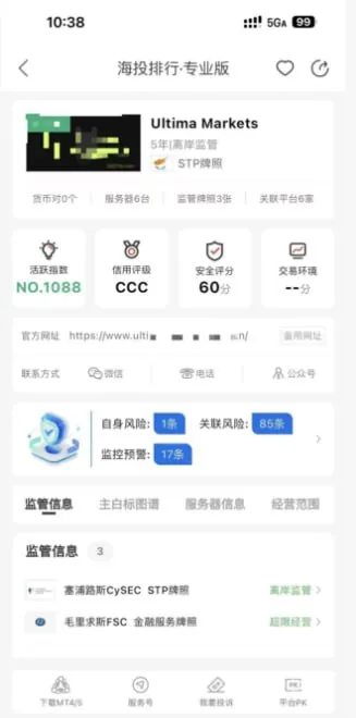 根据第三方外汇平台安全性查询软件海投的数据显示,Ultima Markets排名1088,成立年限5年,该平台拥有3个国家的监管牌照。(注:此评分仅供参考,投资者在选择平台时应综合考虑多种因素,具体监管情况建议投资者自行核实。)