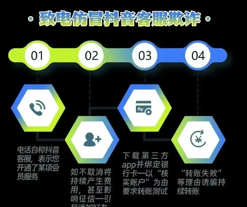 骗子伪装抖音/银联客服,谎称"自动扣费会员已开通"(如每月8000元),用"影响征信""不取消就倾家荡产"等话术吓唬受害人,利用中老年群体对征信、扣费不熟悉的弱点攻破心理防线。
