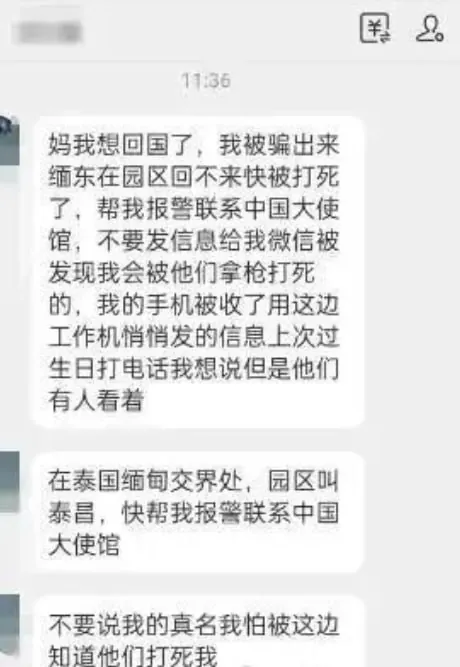 2024年11月份,在广东中山打工的张先生(化姓)接到儿子阿立用支付宝发来的求助消息,儿子特别提醒,不要用微信发消息,如果被发现,自己会被对方用枪打死。