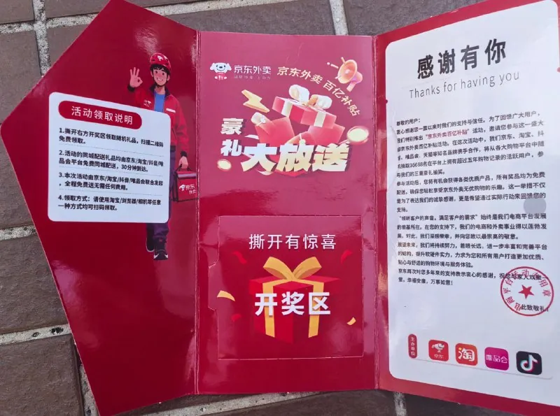 小美小心翼翼拆开里面是一封“感谢信”“感谢您长期支持京东外卖,我们特此送上百亿补贴豪礼一份……”还有二维码、兑奖码、活动说明这谁能不心动?