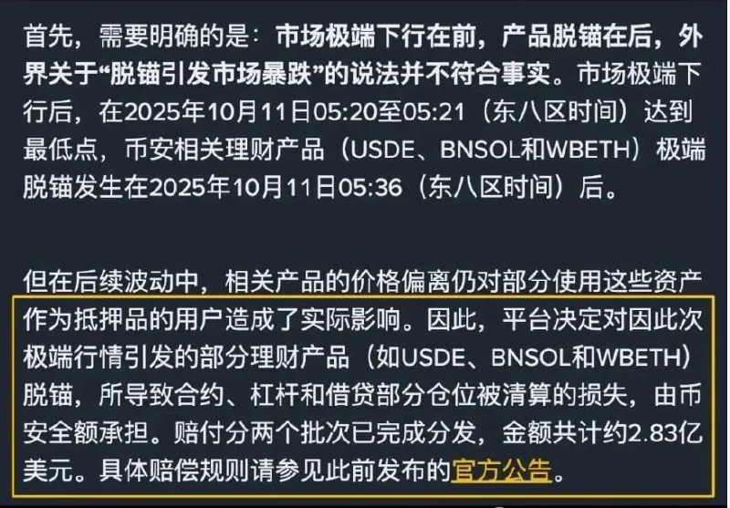 币安在11日紧急发布赔付公告,截至目前已赔付近3亿美元,主要针对脱锚币种受害者。但相较于300亿美元的实际损失,这笔赔偿不过是杯水车薪。更令人担忧的是,大量散户的损失至今无人问津。