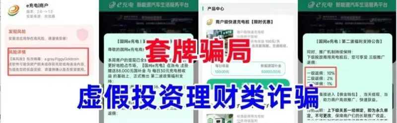 3.“e 充电” APP:冒充企业名义,声称注册领 8.8 万元国补金,需第三方链接下载,收款账户为私人或公司,涉嫌传销与诈骗。