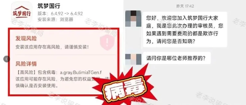 2.“筑梦国行” APP:冒充公职人员,谎称发放 150 万扶贫款,不仅套取信息,还诱导参与 “洗钱”,下载时提示未备案且携带病毒。