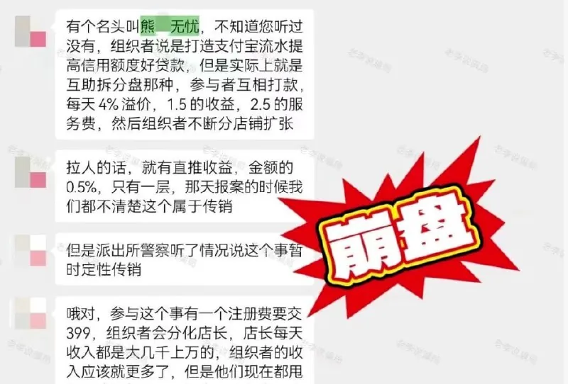 熊某无忧支付宝备用金强制收取用户“399元开户检测费+1000元技术服务费”,随后要求用户用3000-10000元通过支付宝充值在参与者之间互刷流水,并根据流水金额获得相应收益。目前,该项目已经彻底崩盘,众多参与者已经报警立案侦查。