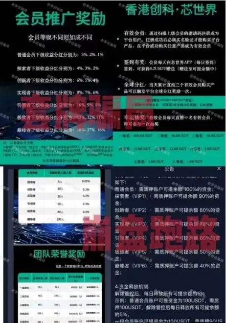 冒充的“芯世界APP”盗用“香港创科”公司信息制作虚假APP。推出多款芯片租赁类投资理财产品,用户通过兑换USDT完成认购获得高额回报。9月3日,平台突然封锁全部用户账号,要求参与者根据级别质押不同比例资金进行解冻。9月8日,项目彻底崩盘跑路,网友因此损失24.8万元。据参与者反馈,其实早在8月底就已经有人无法提现,但大部分人没有相信,并未引起注意。珠海市公安局金湾分局在9月发布的接警案例中曾提到该项目,案例中的两名参与者共计损失43万余元。