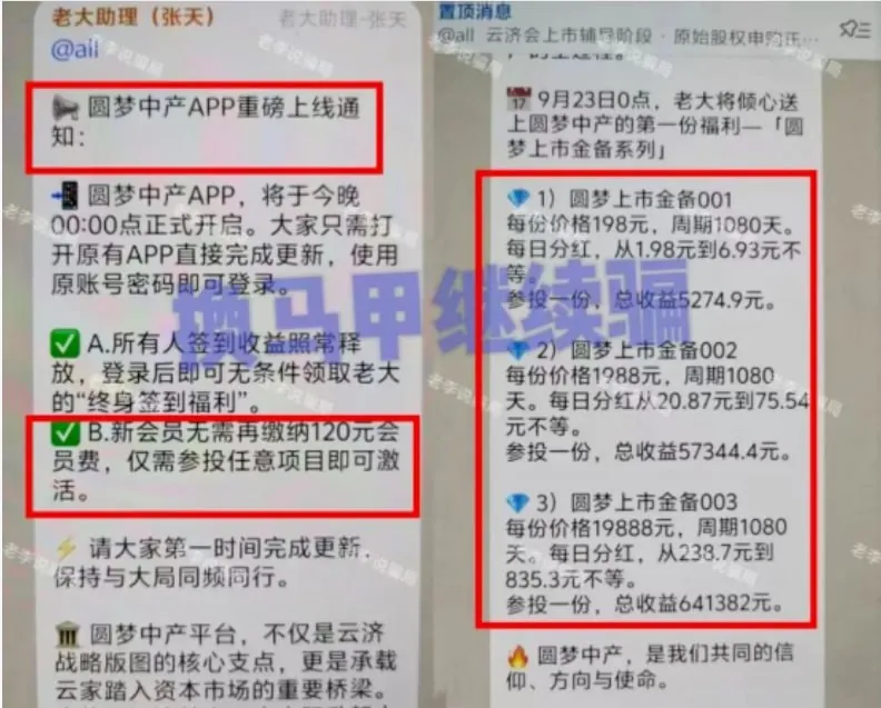 虚构的“云济会”APP不法分子打着“云数贸张健”的旗号,宣称公司要上市,引诱参与者购买“原始股”实施诈骗。网友反馈,节前该项目崩盘跑路,随后更名“圆梦中产”继续圈钱。