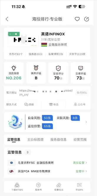 根据第三方外汇平台安全性查询软件海投的数据显示,英诺排名206,成立年限11年,该平台拥有3个国家的监管牌照。(注:此评分仅供参考,投资者在选择平台时应综合考虑多种因素,具体监管情况建议投资者自行核实。)