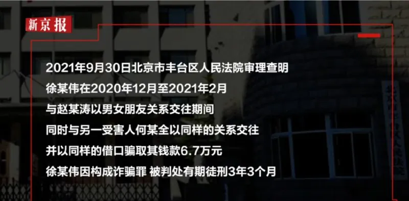 2021年9月30日,北京市丰台区人民法院审理查明,徐某伟在2020年12月至2021年2月与赵某涛以男女朋友关系交往期间,同时与另一受害人何某全以同样的关系交往,并以同样的借口骗取其钱款6.7万元。徐某伟因构成诈骗罪,被判处有期徒刑3年3个月。
