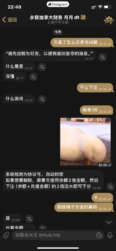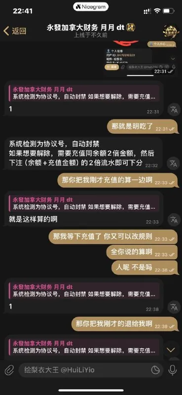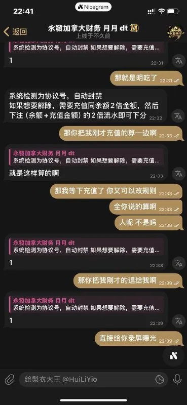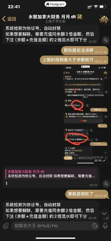 #黑平台 “ #永发加拿大财务 ( #哈希28 )”以所谓“协议号”为由冻结账户,接着要求玩家充值高于余额且大于100的金额才能解封。可笑的是,充值后又要你再充两倍,并要求跑完流水才可提现。最终结果只有一个——钱统统打水漂,提现无门。