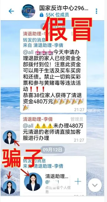 网络中有假冒“国家反诈中心”的骗子在给群里面的人宣传,谎称给每个人退款480万元,这是诈骗,请不要相信!如果已经被骗,赶紧报案!