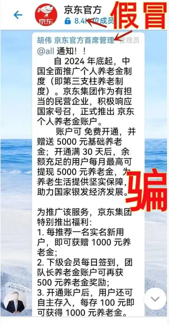 网络中出现了假冒京东高管,假冒京东的“京东官方”群,谎称给参与者发放养老金,这是诈骗,如果已经被骗,赶紧向警方报案!