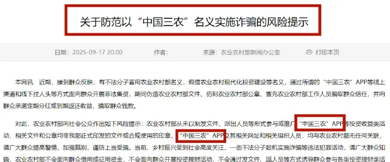 农业农村部:“中国三农”APP是诈骗! 9月17日农业农村部官方网站发布《关于防范以“中国三农”名义实施诈骗的风险提示》
