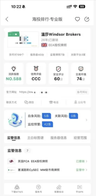 目前,资金冻结与温莎平台出金之间的因果关系尚未确定。根据第三方外汇平台安全性查询软件海投的数据显示,温莎排名588,成立年限26年,该平台拥有7个国家的监管牌照,但具体情况需要进一步核实。(这一评分仅供参考,投资者在选择平台时应综合考虑多种因素。)