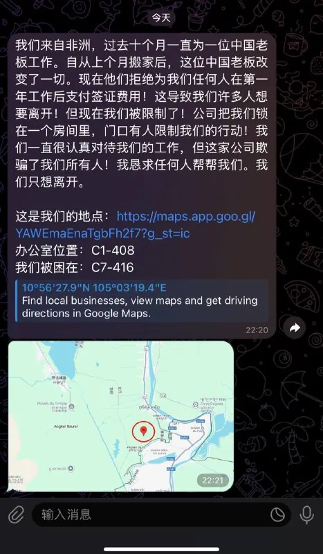 #老外求助 :我们来自非洲,过去十个月一直为一位中国老板工作。自从上个月搬家后,这位中国老板改变了一切。现在他们拒绝为我们任何人在第一年工作后支付签证费用!这导致我们许多人想要离开!但现在我们被限制了!公司把我们锁在一个房间里,门口有人限制我们的行动!我们一直很认真对待我们的工作,但这家公司欺骗了我们所有人!我恳求任何人帮帮我们。我们只想离开。
