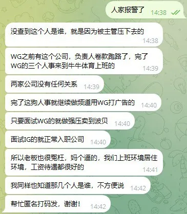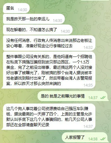 整件事跟公司没有关系的,是他妈逼有一个招聘组在私底下搞强压骗招到波贝那边园区,一个1.5万美金,完了之前没出啥事,最近搞这两个人没对接好出事了被曝光了,刚被搞的那个台湾人据说被本地老婆找到赔付出来了,然后带着台湾人去警局报案,所以昨天才那么突然来端的。