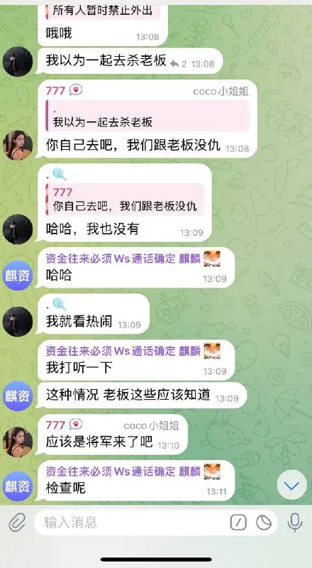 在kk俱乐部群里,群主是十三姨,在kk博彩楼四楼博彩公司上班,群主十三姨曝光军方来园区拍照,不让乱走动乱动,说军方来了只是走个过场,走个形式,说军方武装护诈,不是真正铲除电诈等,已经被中国的公安部,外交部知道了。