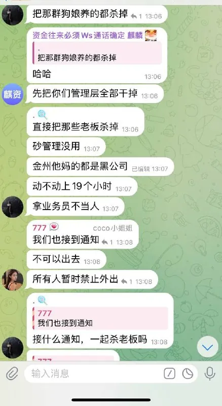 园区封禁这个消息,结果在yoyo鸡头的群里,直接给爆出来了,目前中国的公安部,中国外交部,和央视新闻全部报道出来了,中国的警方公安部将和缅甸妙瓦底军政府,缅军,调查此事,解救中国同胞,严惩凶手,还有在新世界不忘初心群里,群主是777和世豪和管理员,麒麟,777,李琳,世豪,陈浩南等群主管理员密谋杀自己公司和别的公司老板,并说金州都是黑公司,动不动上19个小时,拿业务员不当人。