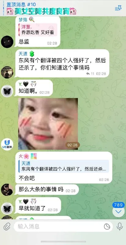 在kk某群里,群主是yoyo,爆出来个惊天大瓜,东风园区有个女翻译被四个人轮奸,轮奸完把女翻译直接杀害了。