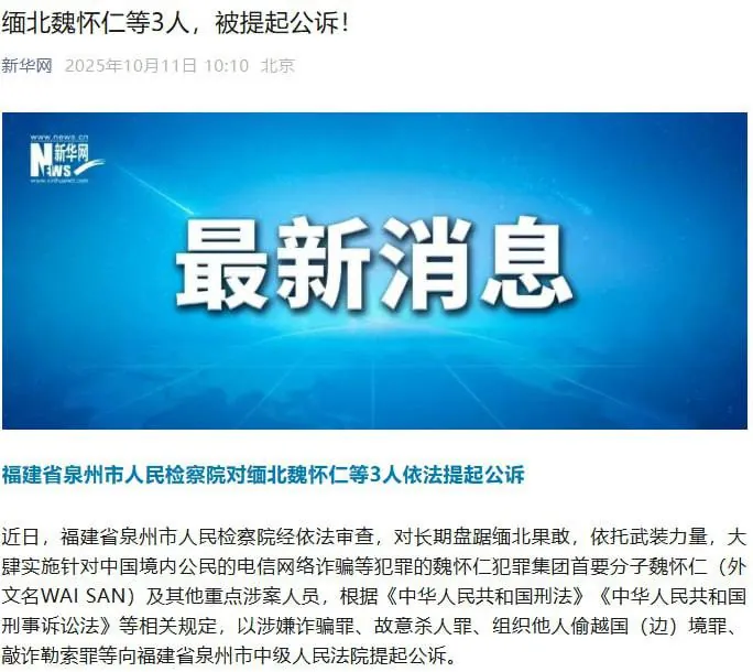 近日,福建省泉州市人民检察院经依法审查,对长期盘踞缅北果敢,依托武装力量,大肆实施针对中国境内公民的电信网络诈骗等犯罪的 #魏怀仁犯罪集团 首要分子 #魏怀仁 (外文名WAI SAN)及其他重点涉案人员。