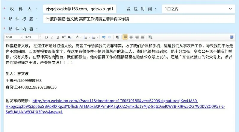诈骗犯 #曾文波 , 在湛江市通过打造人设,高薪工作诱骗我朋友去菲律宾,收了我朋友护照和手机,逼迫我朋友从事灰产工作,导致我朋友不敢走也不敢回国,回国举报要面临坐牢,在这里有很多并不情愿做灰产的湛江人,他们也很想回到家,他十分嚣张,多次公开说不怕举报,说有关系,在菲律宾也有后台,他们都很怕,他的招募工作的链接甚至在微信公众号上发布,还是广东省旅就业的公众号上!!!!