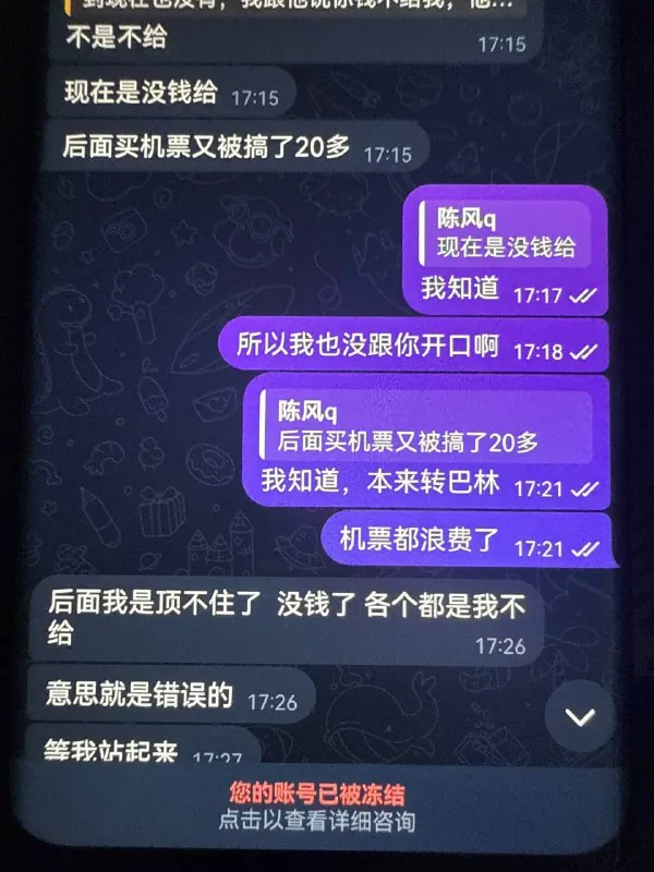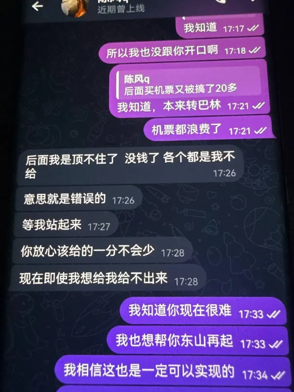 陈老板一年多了,从迪拜公司出事,你连夜就跑了,对于自己的员工你是不管不问,我跟我兄弟给你做了几十万U的业绩,你良心呢?你不是说过你不会差任何人一分钱吗?