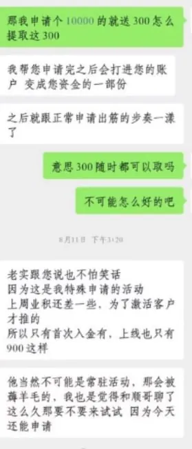 外汇赠金本质上是经纪商的营销工具,旨在吸引新客户并刺激交易活跃度。投资者应理性看待,在参与任何赠金活动前,务必逐条审阅活动规则,重点关注交易量要求、赠金的可提现性、对出金的影响以及有效期等关键条款。记住,选择平台应优先考虑其监管资质、安全性与交易环境,而非单纯的赠金优惠。据用户A某反映,其经历了如下情况:A某表示,自己是经该平台业务员的介绍下,了解到平台有个入10000美金送300美金的活动。据A某提供的与业务员聊天记录截图显示,业务员在沟通中表示没有手数要求和时间限制,入金后可随时提现。(A某 查看更多