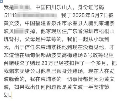#网友爆料:被从小长大的结拜好兄弟从国内诱骗过来卖到公司,只为偿还他这个烂赌鬼的帐,我们八个人是从小一起长大的,这个狗东西,嗜赌成性,嘴巴没有一句真话,到处坑蒙拐骗。以前把自己卖去园区,后面被人救出来,不但不感恩,还瞎说不认账,这次又把自己输给了缅甸孟波美高梅赌场,在6号柜台拿了码,然后想尽办法找公司说要开代理线,以进人为理由,诱骗公司拿了23万来赎他出赌场,出赌场之后不认,不去公司,逃跑,相片被缅甸佤邦各大关卡通缉,叫了我跟大炮出来。我们两个人现在要替他偿还账务,公司说了不是钱的问题,然后还要 查看更多