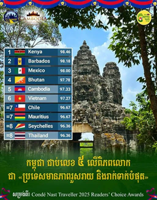 柬埔寨被评为世界第五大友好国家柬埔寨在《康泰纳仕旅行者》2025年度读者选择奖中被评为全球第五大最友好国家。柬埔寨以 97.33 分的成绩位居榜首,越南和泰国分别以 97.27 分和 96.36 分位列第六和第八。评语称:“这片土地本身就拥有众多主要城市,例如繁华的河畔首都金边,以及宏伟的吴哥窟,后者是世界闻名的大型宗教遗址。但前往乡村地区才能真正深入了解这里,那里的高棉寄宿家庭项目展现了丝绸织造村落和辛勤农场的丰富文化。”