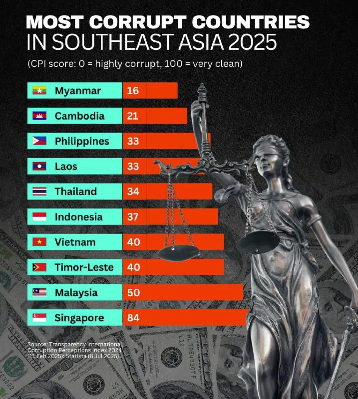 #2025东南亚腐败报告出炉缅甸垫底,新加坡遥遥领先!国际透明组织最新发布的《2025年清廉指数报告》显示,腐败仍是东南亚各国面临的长期顽疾,区域内国家之间的廉洁程度差距愈发明显。根据报告,缅甸以 16分 位居东南亚最腐败国家,其次是 柬埔寨(21分),反映出两国在治理透明度、问责制度及法治落实方面仍存在严重问题。中等区间的国家包括 菲律宾(33分)、老挝(33分)、泰国(34分) 及 印尼(37分),虽持续推动反腐改革,但制度性障碍依旧明显。相比之下,越南(40分) 与 东帝汶(40分) 在提 查看更多