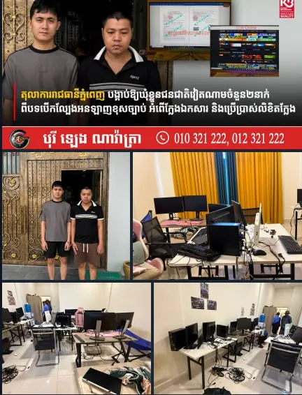#柬埔寨新闻 金边市法院下令拘留两名越南公民,罪名是非法网络赌博、伪造和使用假信件。2025年10月14日,金边市法院预审法官Nhim Pisal签发两项命令,将两名越南男子拘留在第一惩教所M“1”号。两名被告人分别是:第一名被告人PHAN HUU KHANH,男,28岁,网络工作者;第二名被告人PHAN THANH DAT,男,26岁,网络工作者。两名被告人因涉嫌诈骗、非法网络赌博(在线赌场)、伪造和使用伪造文件等罪名接受调查,犯罪地点为金边市 Chbar Ampov 区 Veal Sbov 查看更多